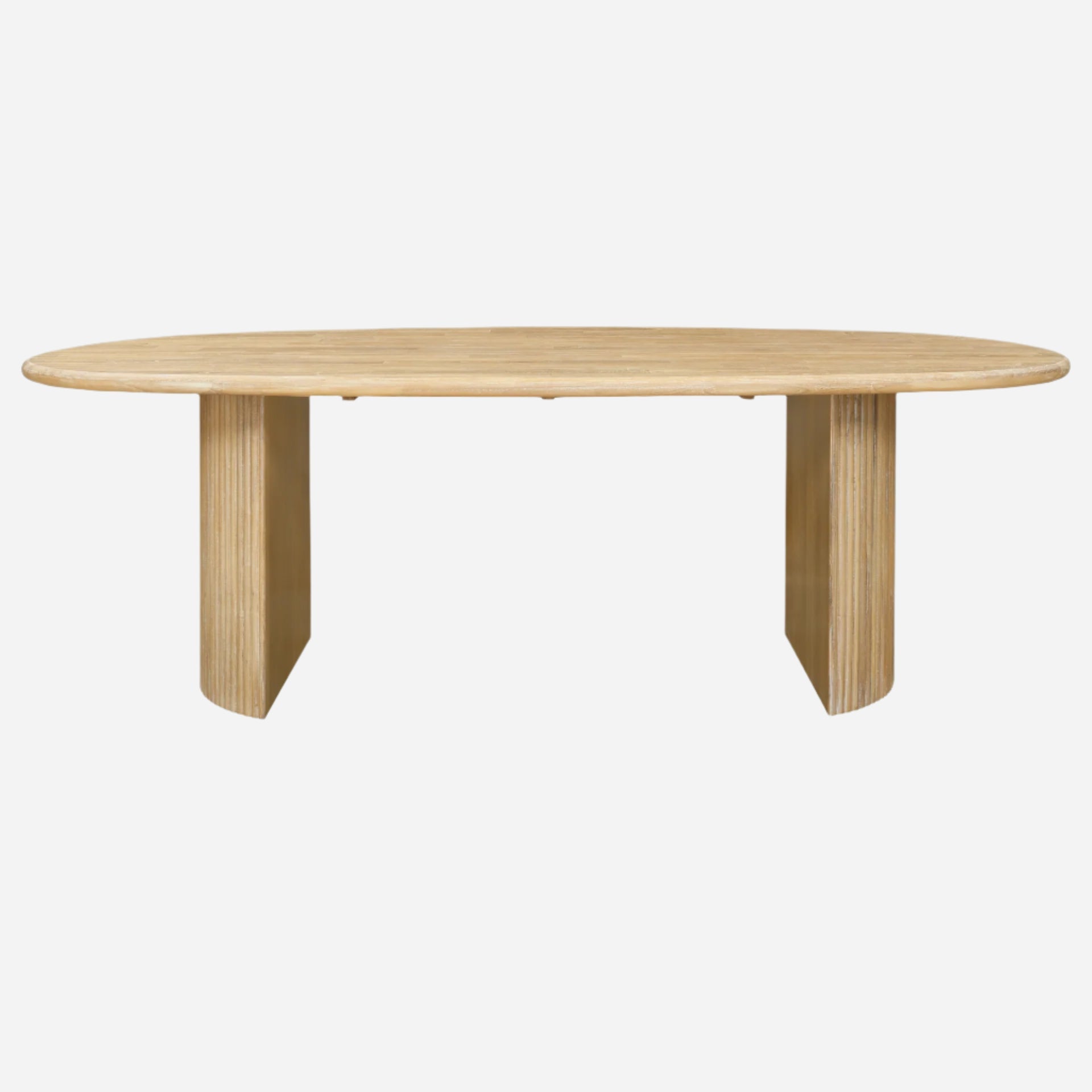 The Aniston dining series blends modernism with a Zen-inspired design, featuring a sculpted oval tabletop and crescent-shaped legs with a ridged wood texture. Measuring 92.5" wide, this table is crafted with a solid mindi wood tabletop, offering durability and natural elegance. The whitewash finish enhances its clean and tranquil aesthetic.