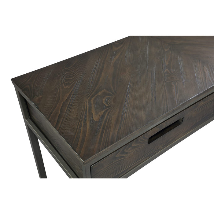 The Bradley Occasional Collection combines an open, airy design with functional elegance. Centered around a display case-style coffee table, it ensures easy access to everyday essentials while maintaining a sleek, modern aesthetic. The chevron-matched pine veneer surfaces are lightly wire-brushed and heavily glazed, enhancing the natural grain for added depth and texture. A sturdy box-frame metal base, finished in a textured powder coat, provides durability and visual interest.